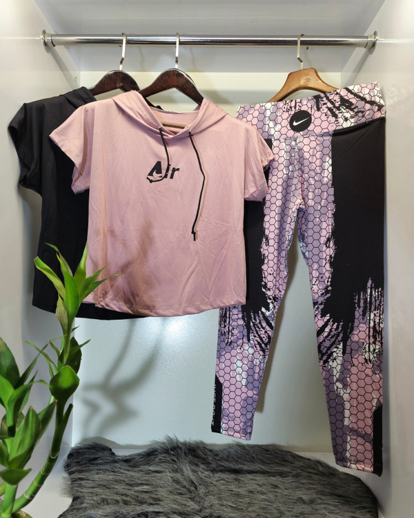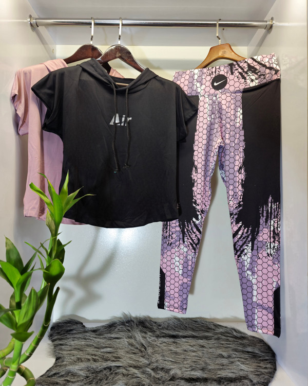 کراپ شلوار لباس ورزشی زنانه طرحدار مدل نایکی | کراپ تیشرت کلاهدار و لگ کمرگنی |