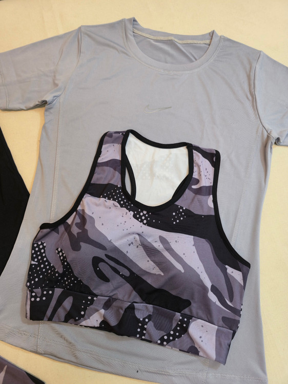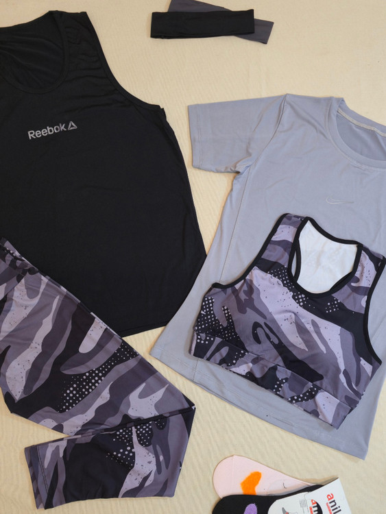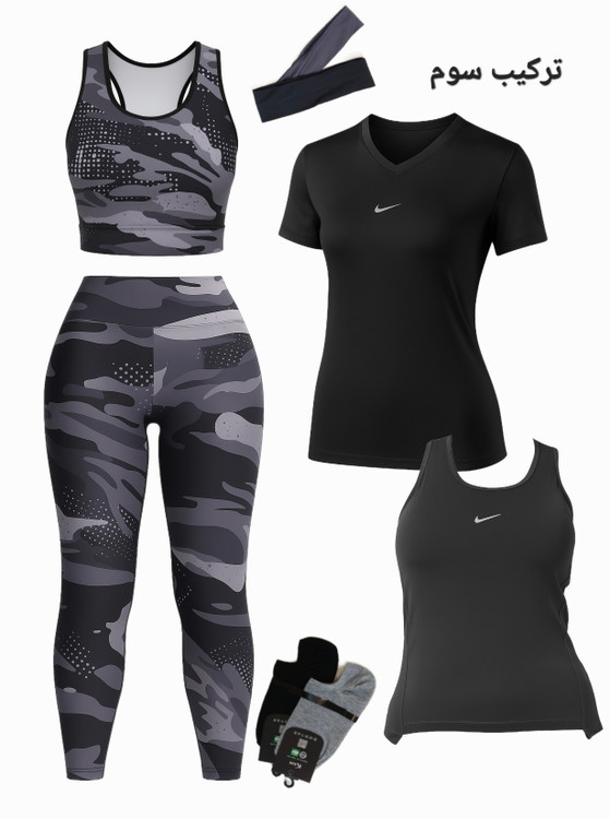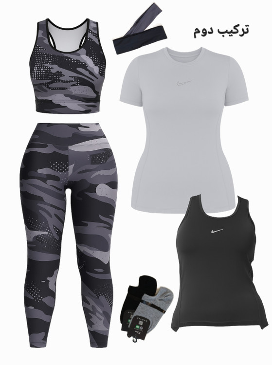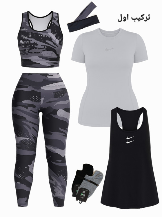 لباس ورزشی زنانه سایز ۳۶ الی ۴۲ | شش تکه اقتصادی | نیمتنه، لگ ، کاور تاپ ، تیشرت ، هدبند ، جوراب |