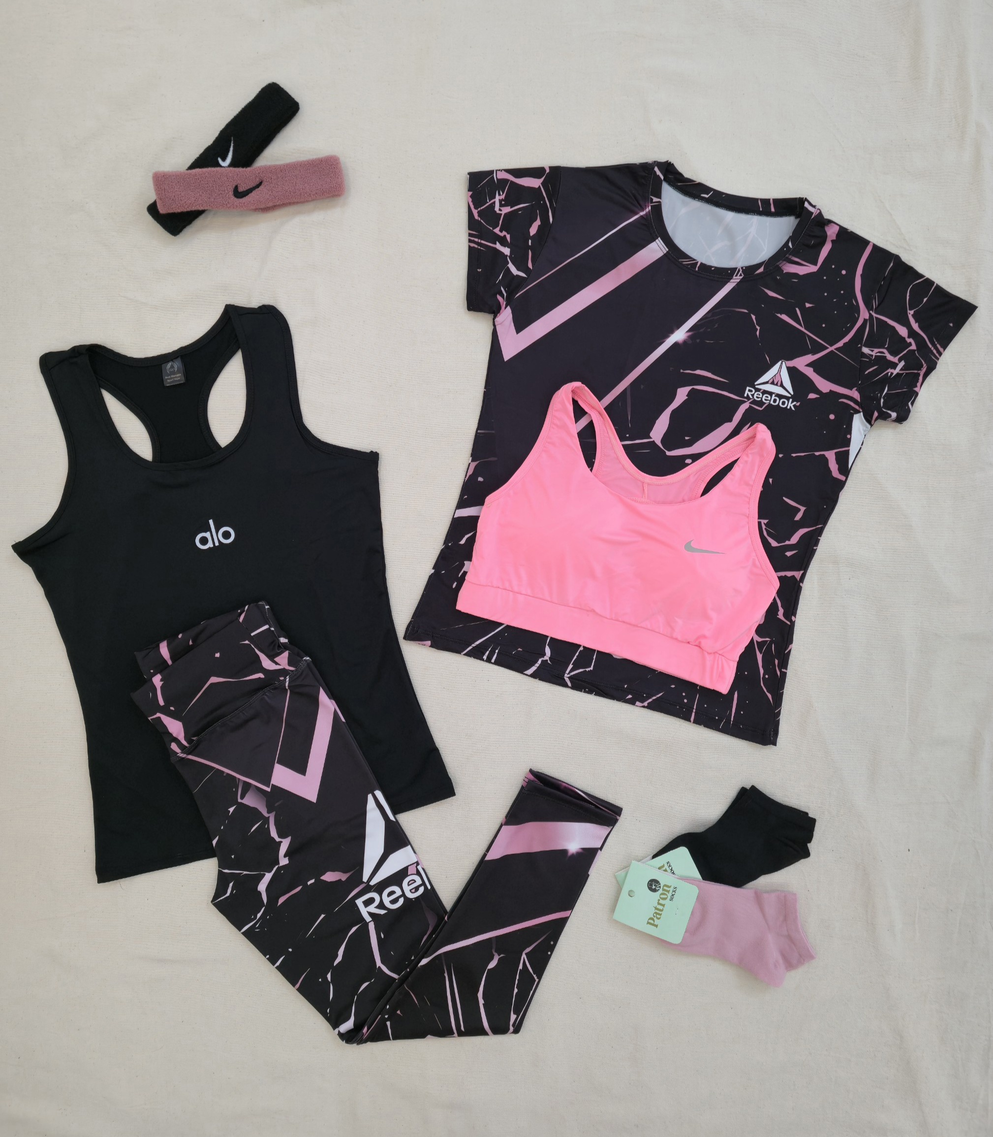 لباس ورزشی زنانه سایز ۳۴ الی ۴۲ | ۶ تکه اقتصادی | نیمتنه، لگ ، تیشرت ، تاپ ، جوراب ، هدبند |