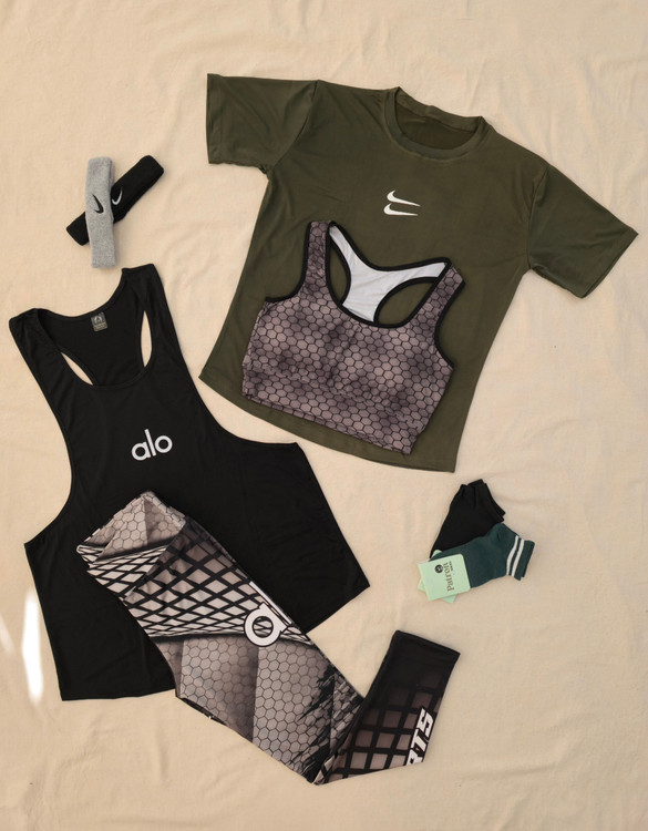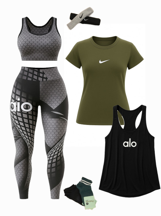 لباس ورزشی زنانه سایزبزرگ ۴۲ الی ۴۸ | ۶ تکه اقتصادی | نیمتنه، لگ ، کاور تاپ ، تیشرت ، جوراب ، هدبند | کد ۱۳۰۲