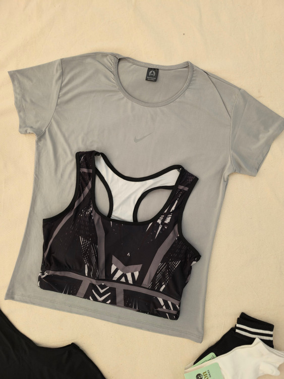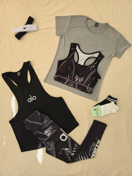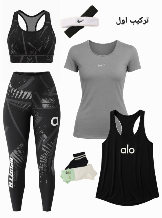 لباس ورزشی زنانه سایز ۳۶ الی ۴۰ | ۶ تکه اقتصادی | نیمتنه، لگ ، کاور تاپ ، تیشرت ، جوراب ، هدبند | کد ۱۳۱۰
