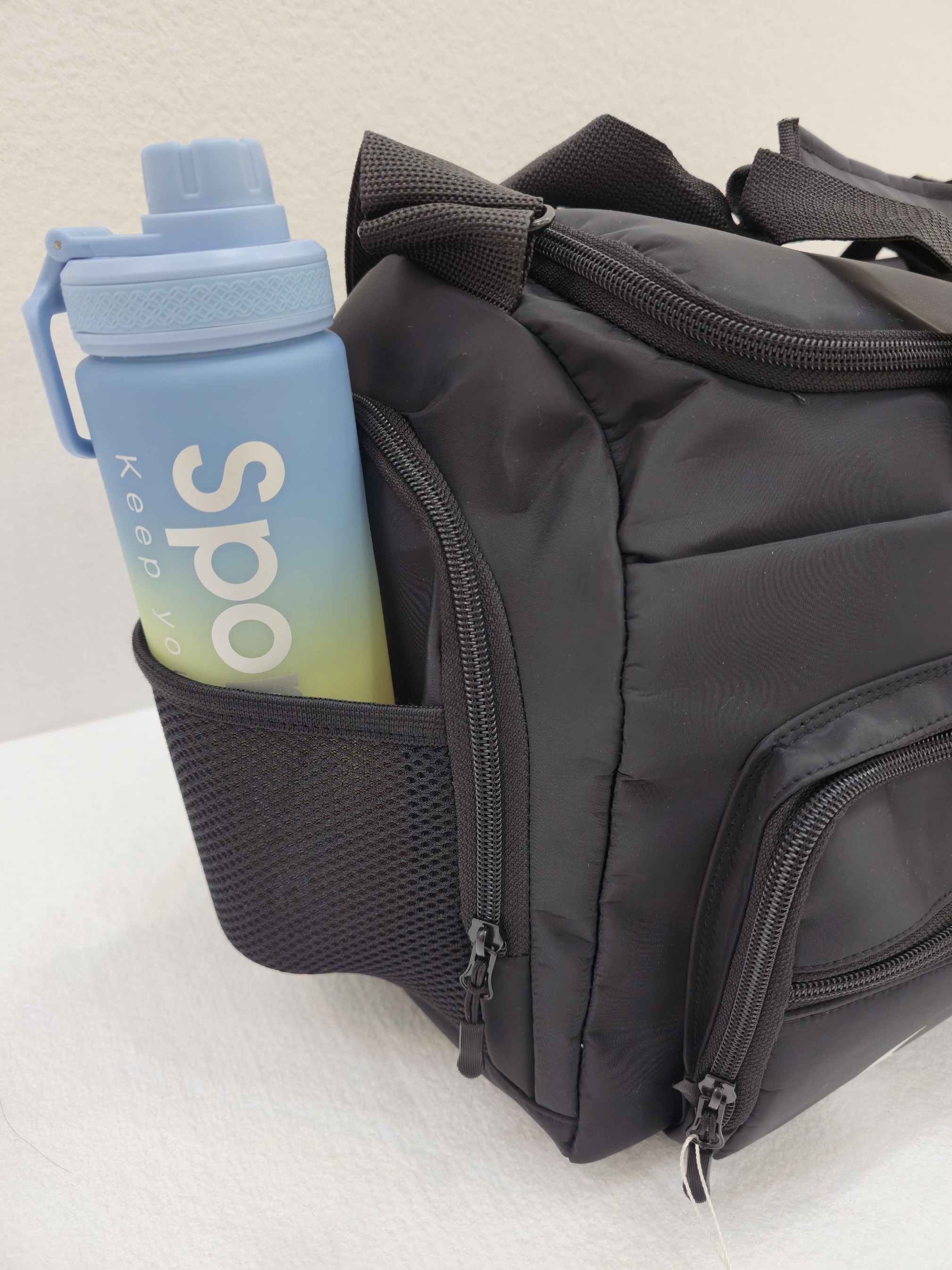 کیف دارای : دو جیب کاربردی و یک جای مجزا برای قمقمه در جلو و یک جیب اصلی ، یک جیب بزرگ در کنار و در طرف دیگر یک جیب به عنوان جاکفشی میباشد.