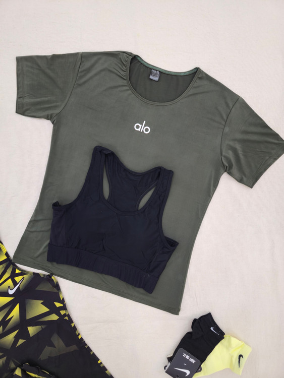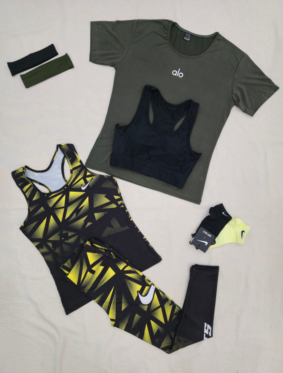 لباس ورزشی زنانه سایز ۴۲ الی ۴۸ | ۶ تکه اقتصادی | نیمتنه، لگ ، تاپ ، تیشرت ، جوراب ، هدبند | کد ۱۳۱۶