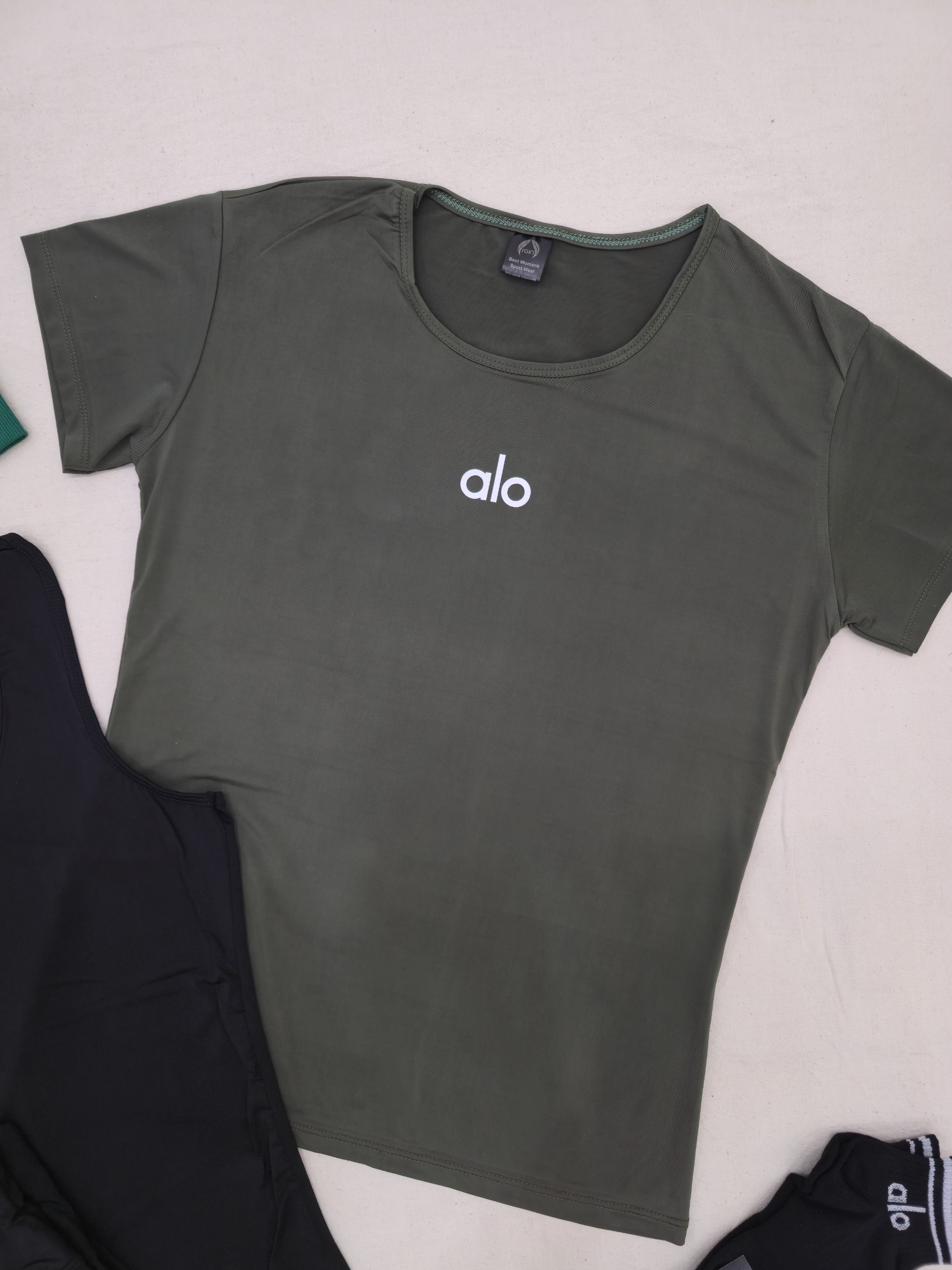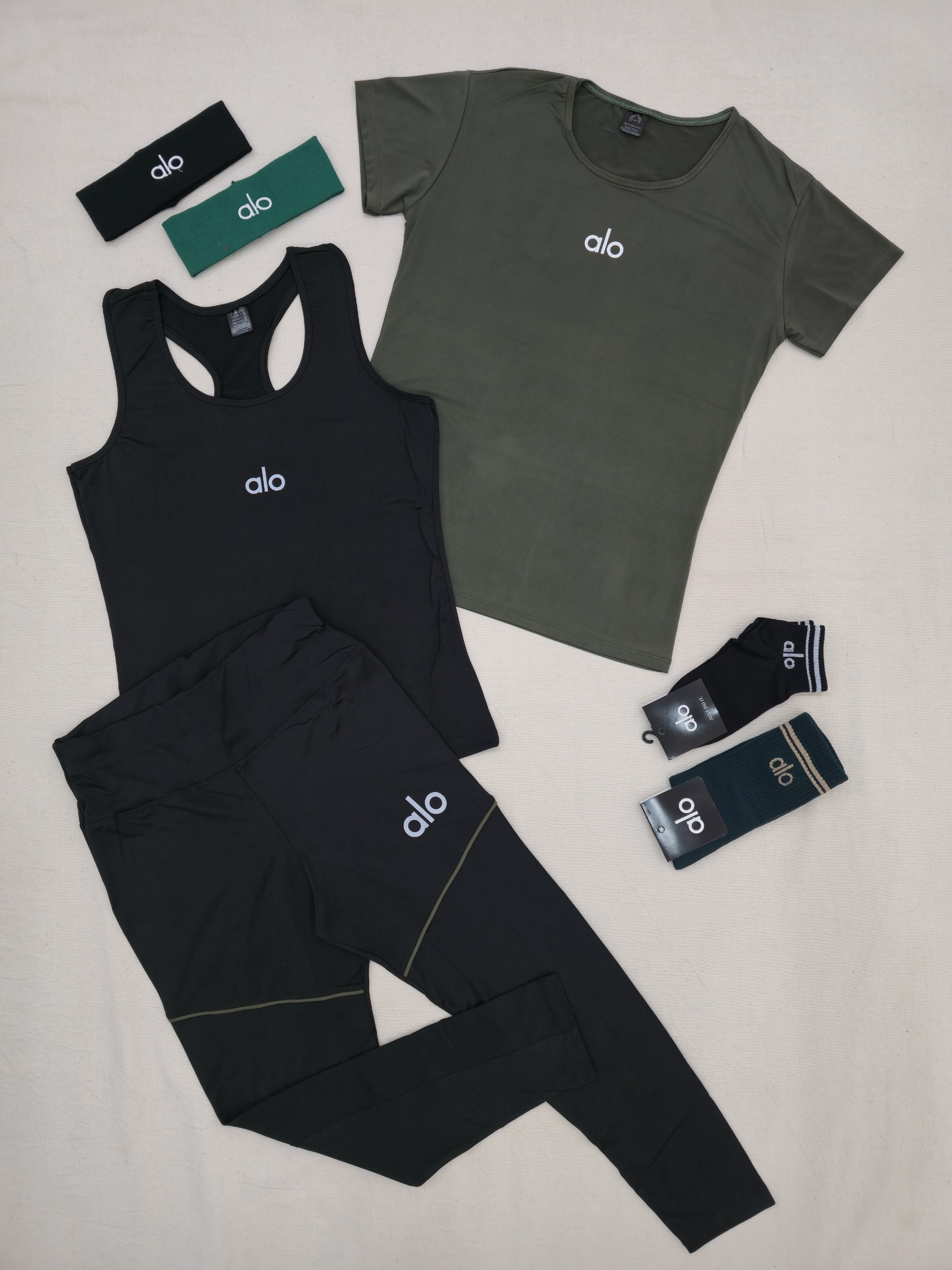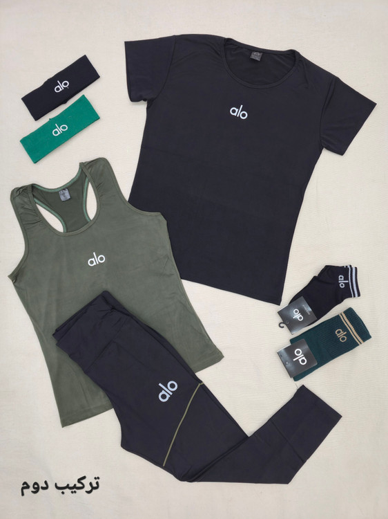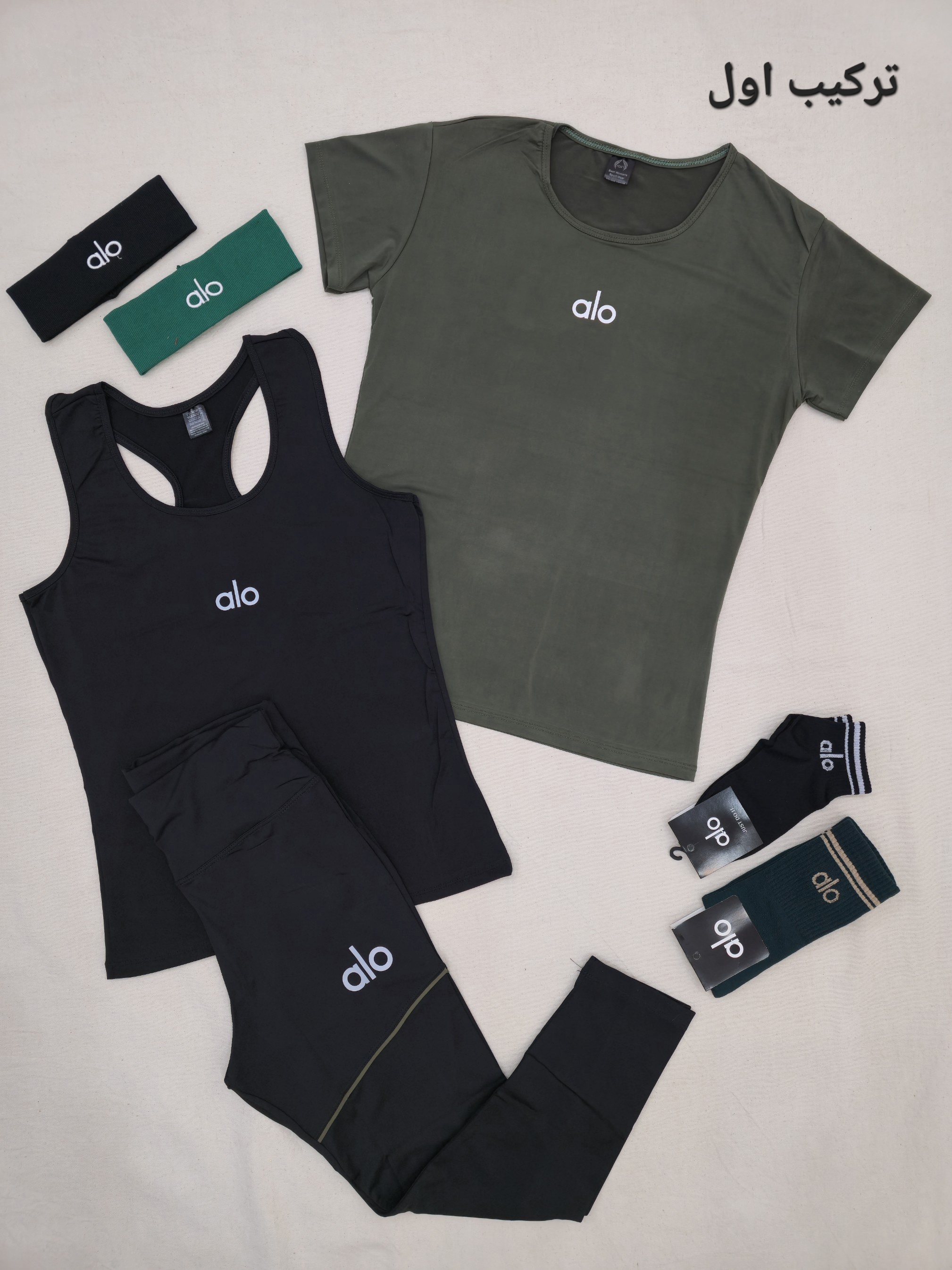 لباس ورزشی زنانه سایز ۳۶ الی ۴۲ | ۷ تکه پیشنهاد اقتصادی | تاپ قهرمانی، تیشرت، لگ ، جوراب ، هدبند | ست ورزشی سبز ارتشی